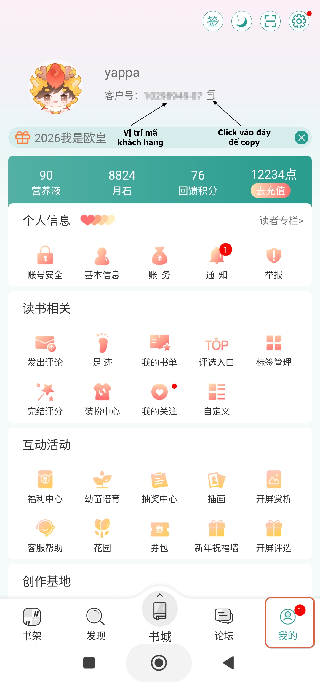 Ấn vào tab 我的, mã khách hàng sẽ nằm ngay dưới nickname của bạn. Click vào biểu tượng copy thì app sẽ tự động copy mã cho bạn.